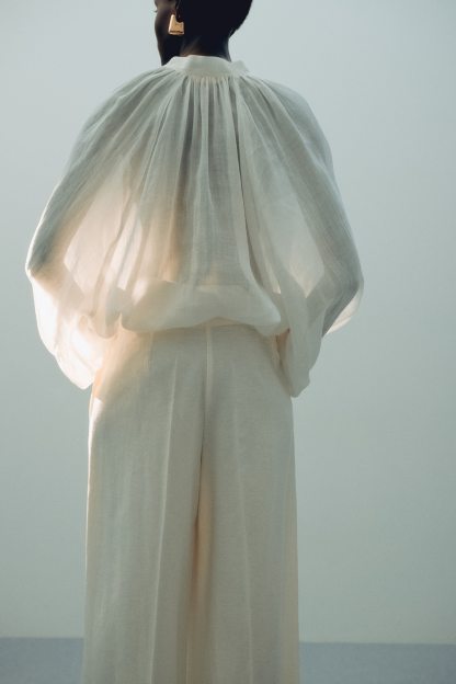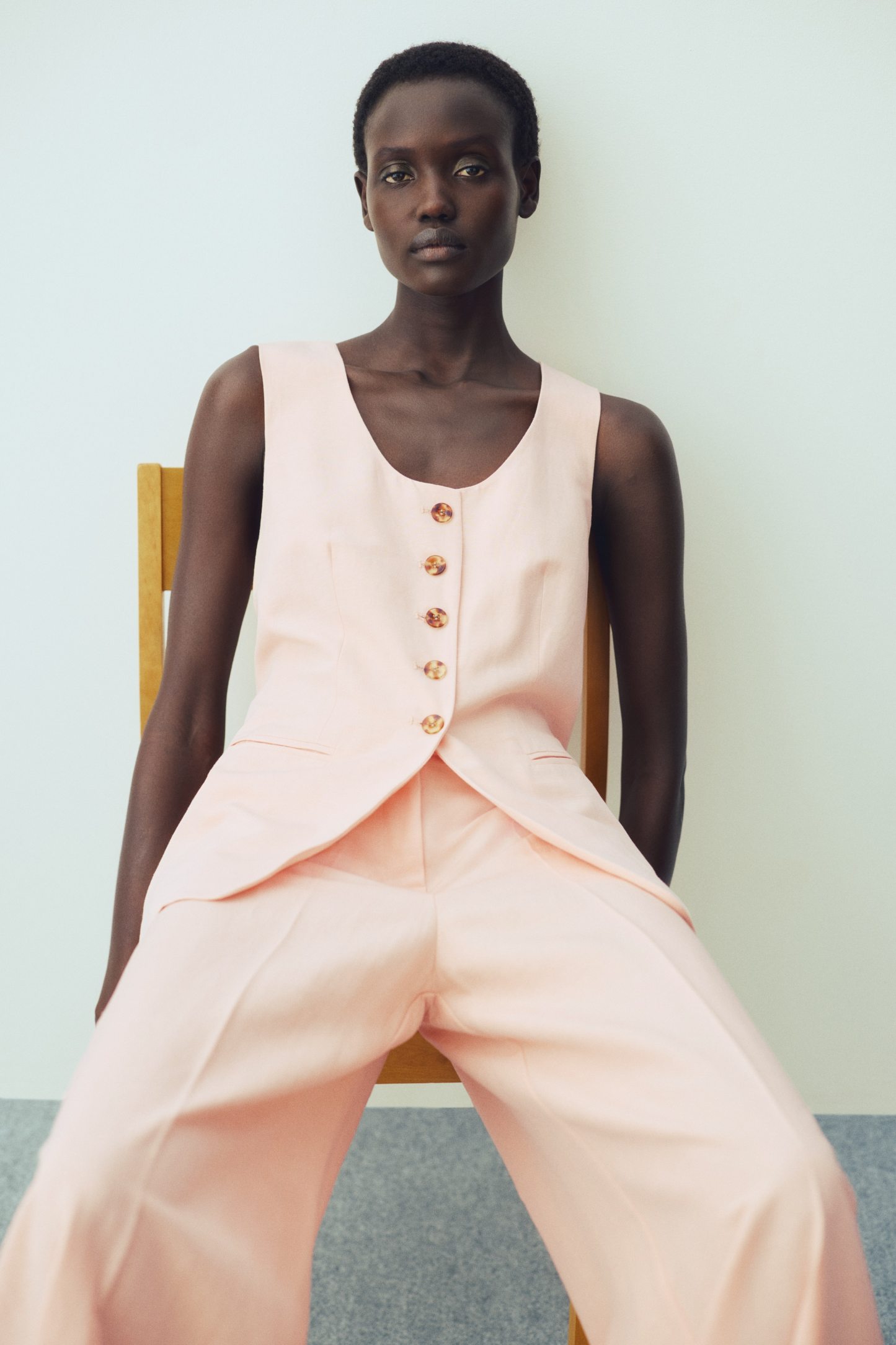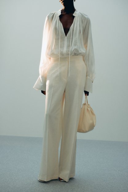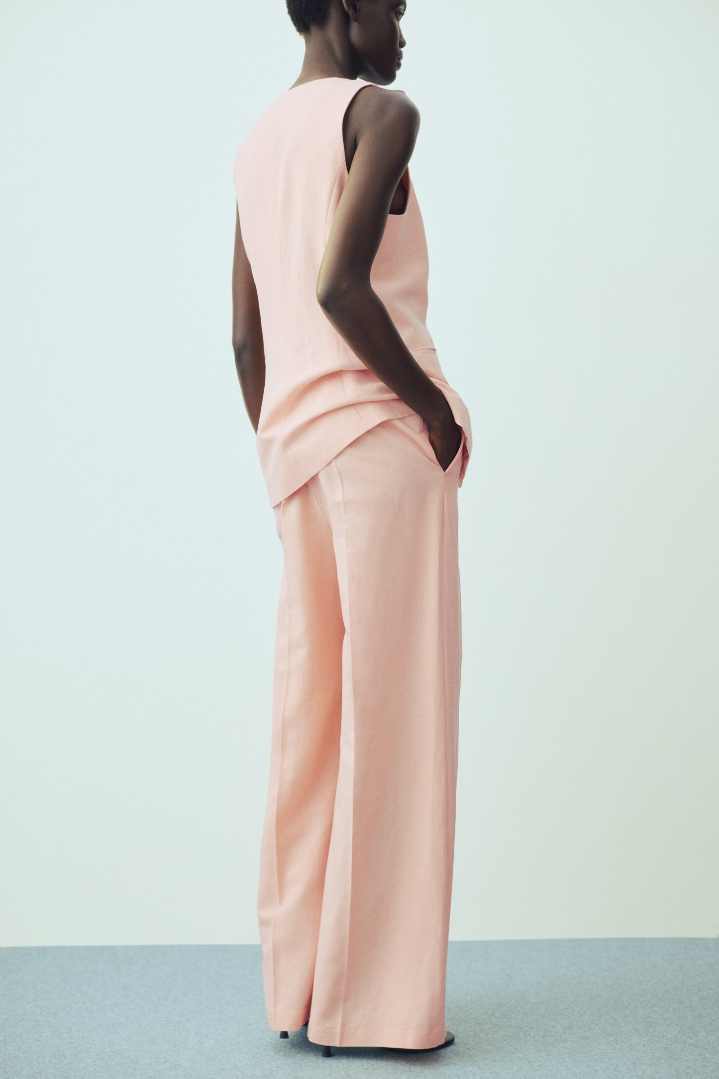 Loose-fit trousers in an airy weave made from a linen blend. High waist with a zip fly and a concealed div and hook-and-bar fasteners. Diagonal side pockets and wide legs with creases down the front and back.