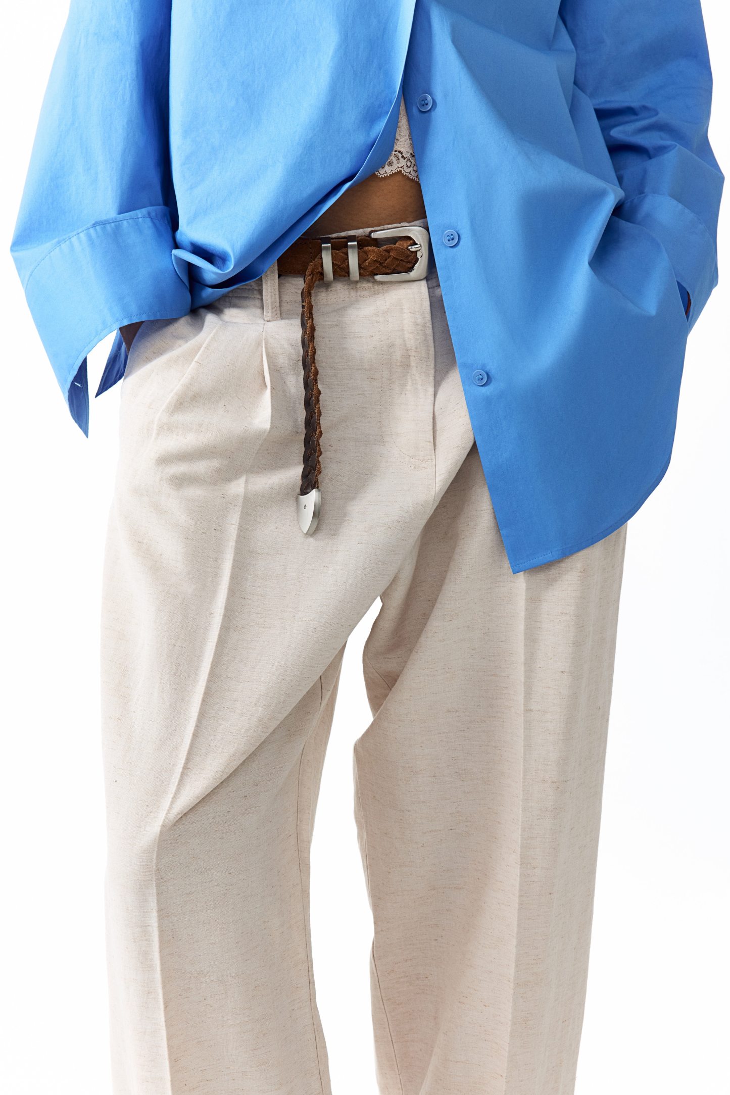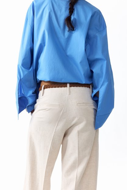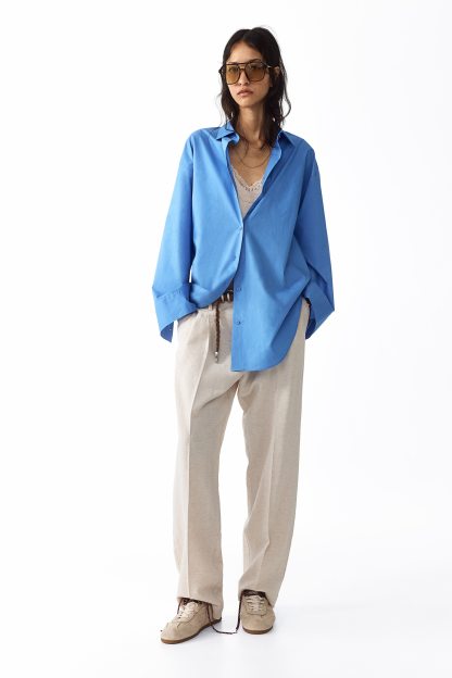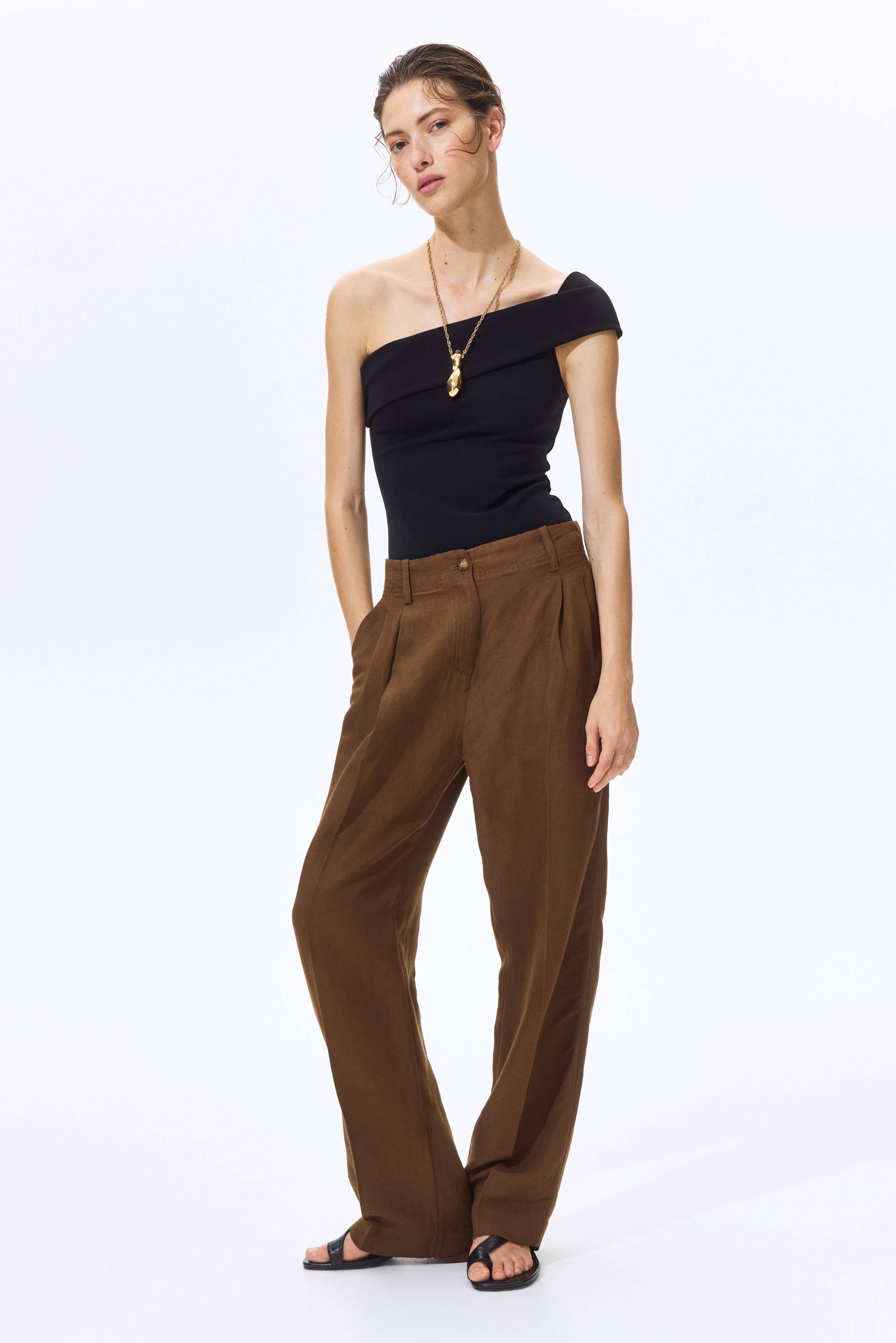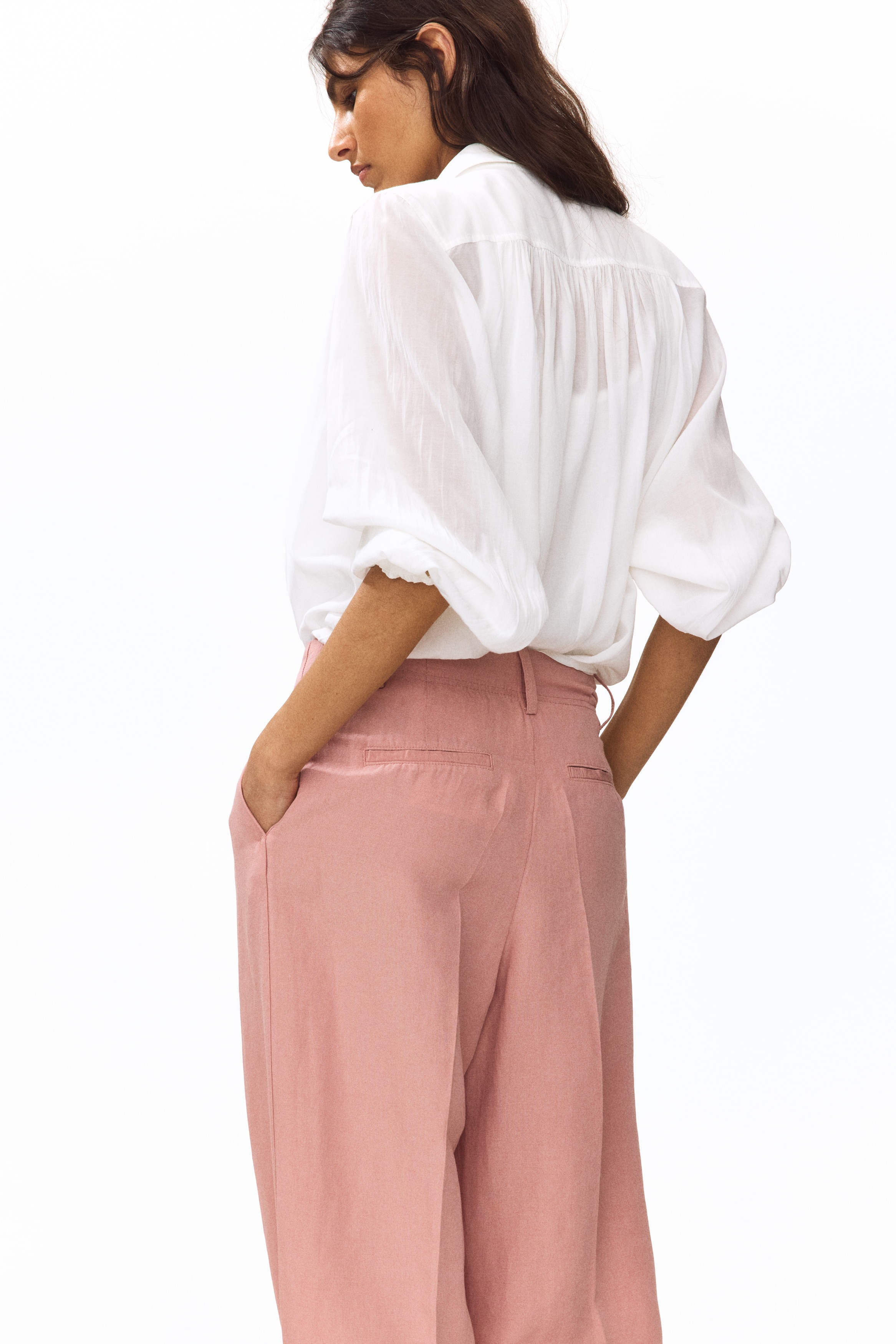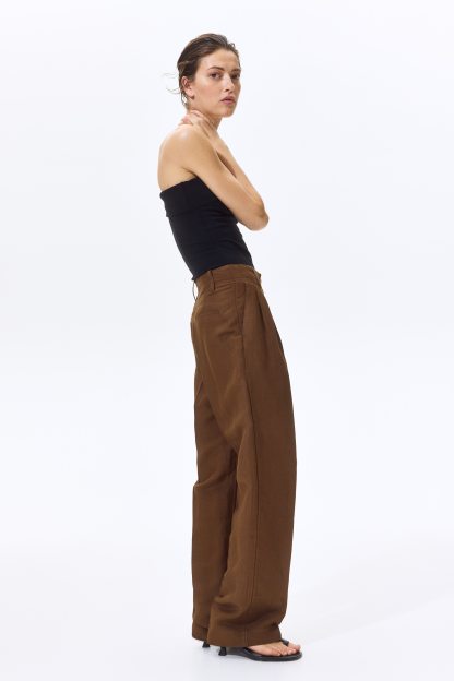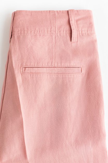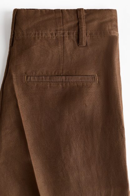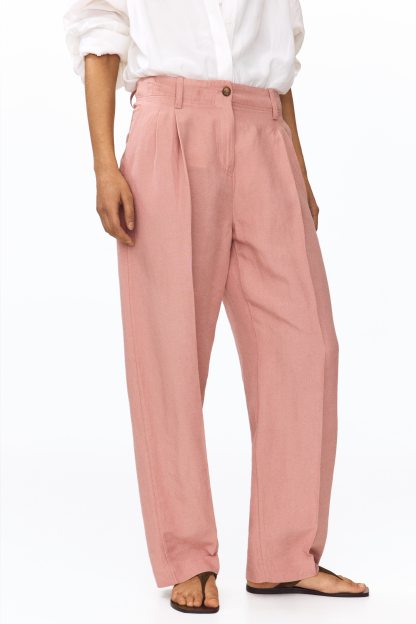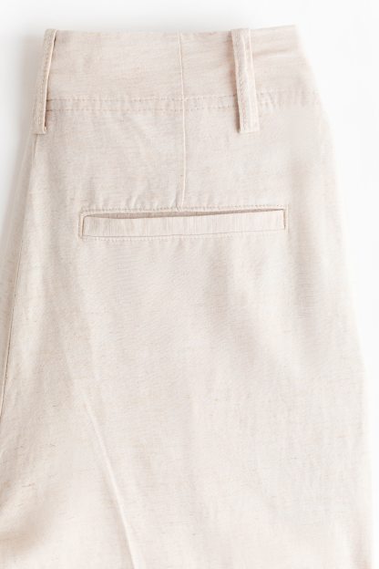 Loose-fit trousers in a linen-blend weave with a zip fly and div. Diagonal side pockets, welt back pockets and tapered legs with pleats at the front and creases down the front and back.
