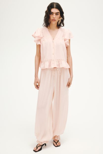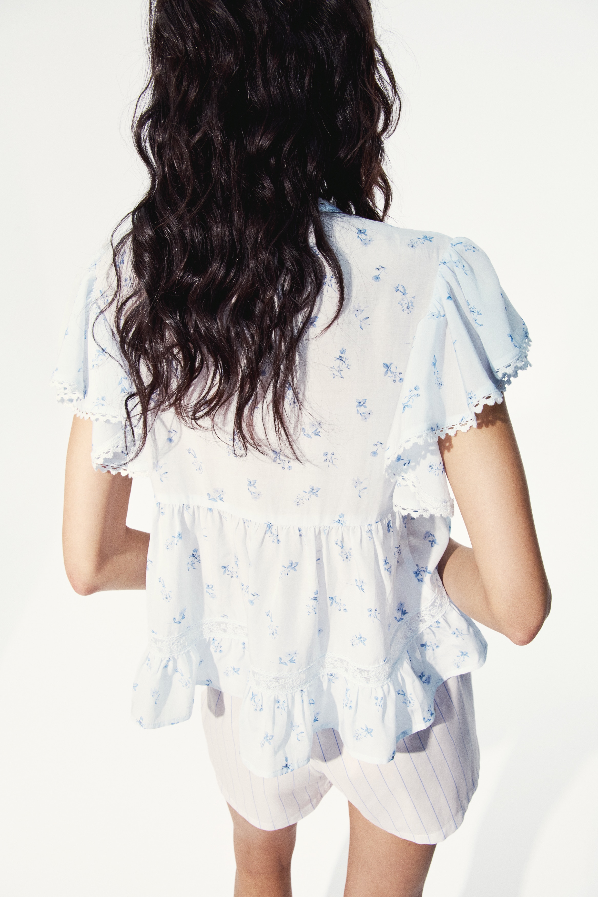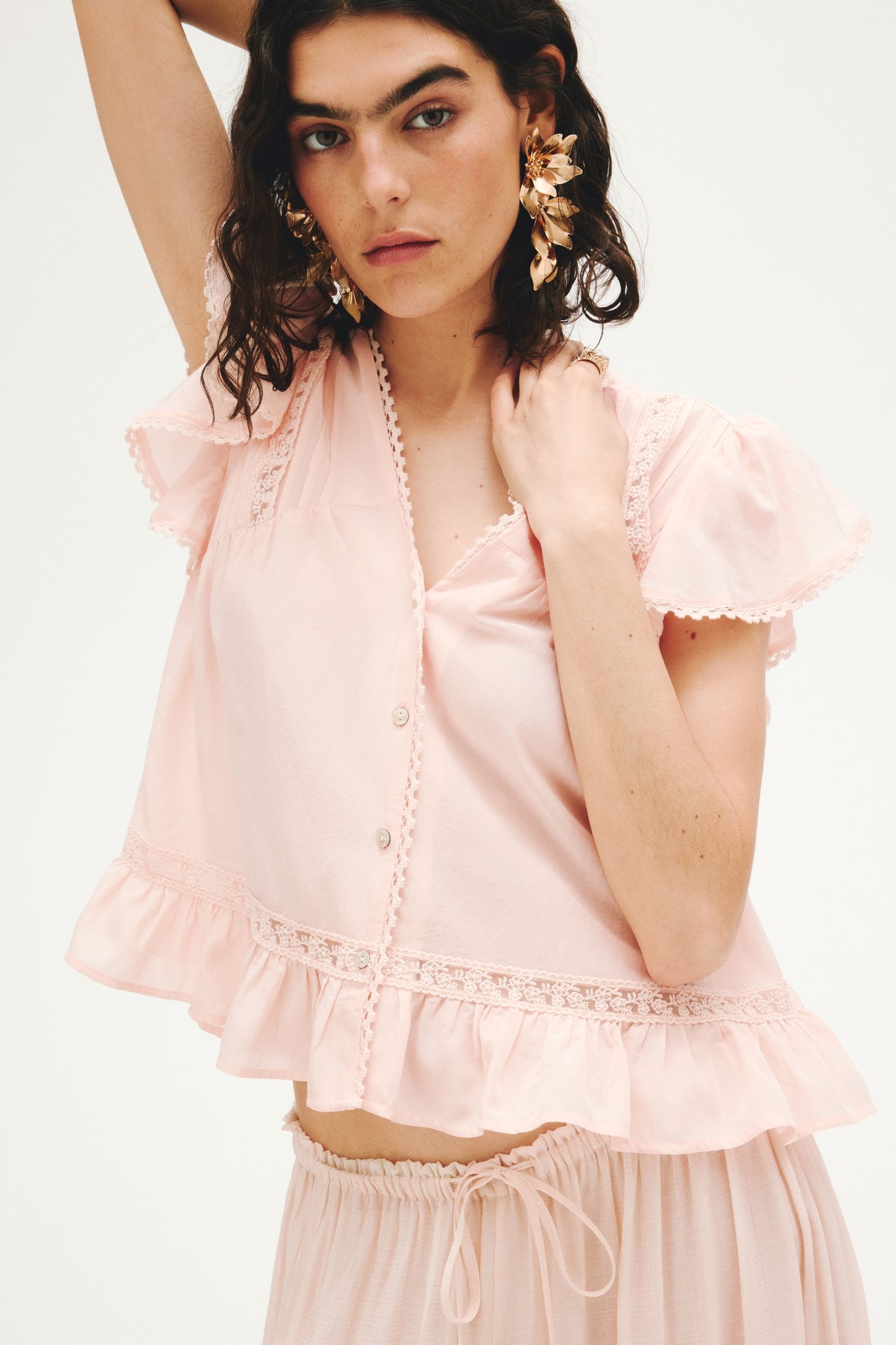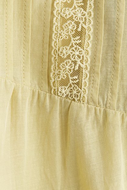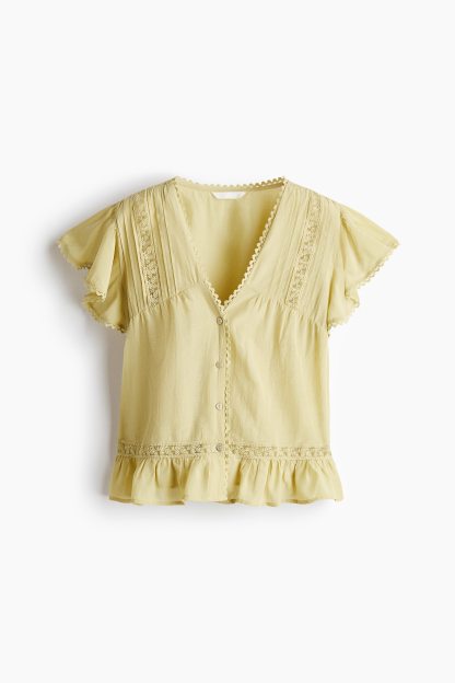 Blouse in an airy weave with lace insets and pintucks. Features a deep V-neckline, divs down the front and short butterfly sleeves.