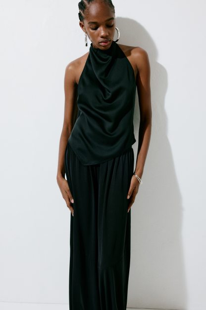 Halterneck top in a lyocell weave with a sheen. Cowl neckline, divs at the back of the neck, a concealed zip at one side and an asymmetric hem.