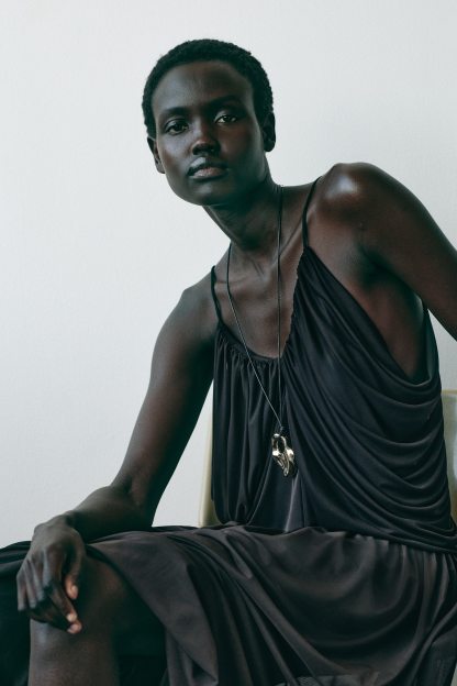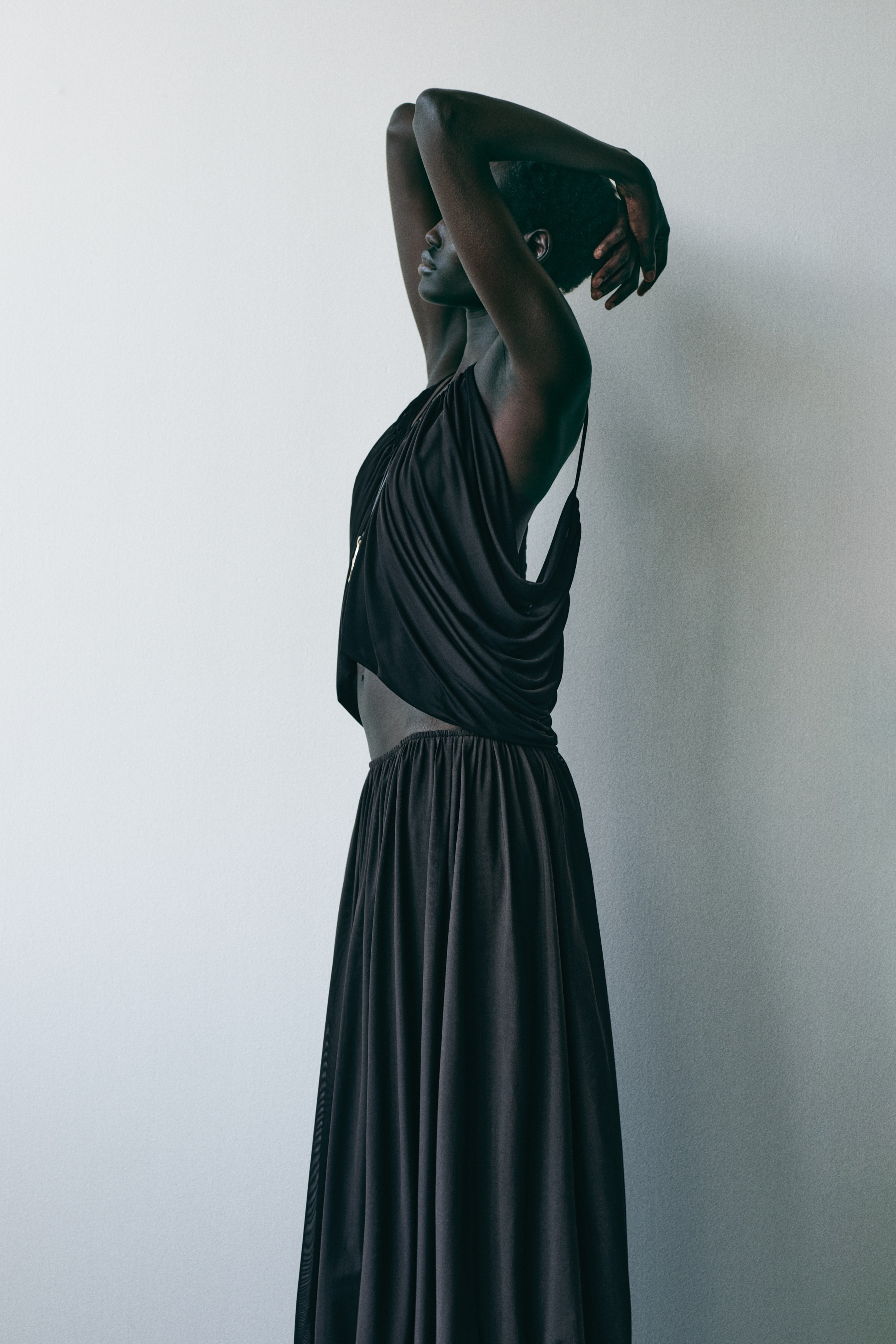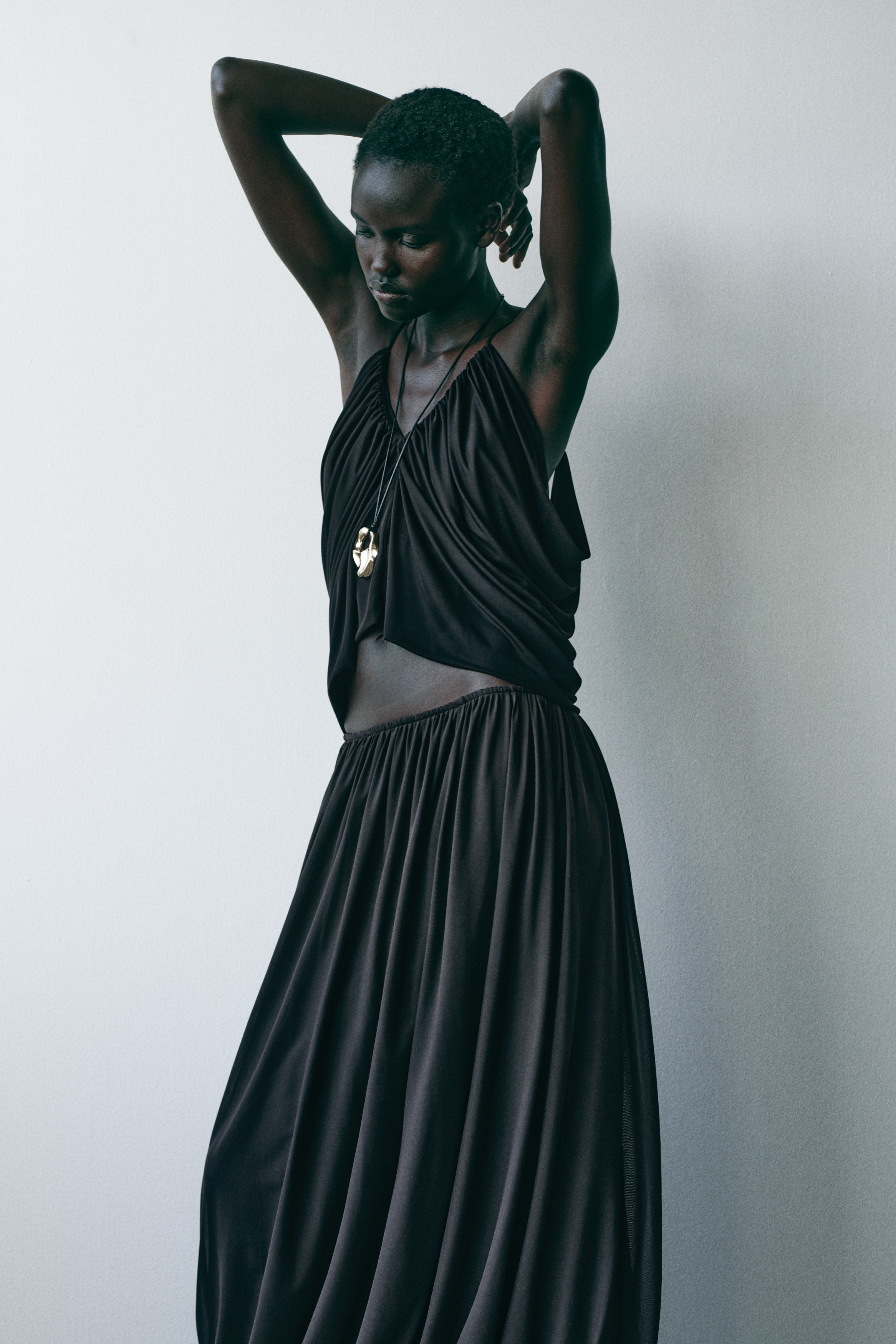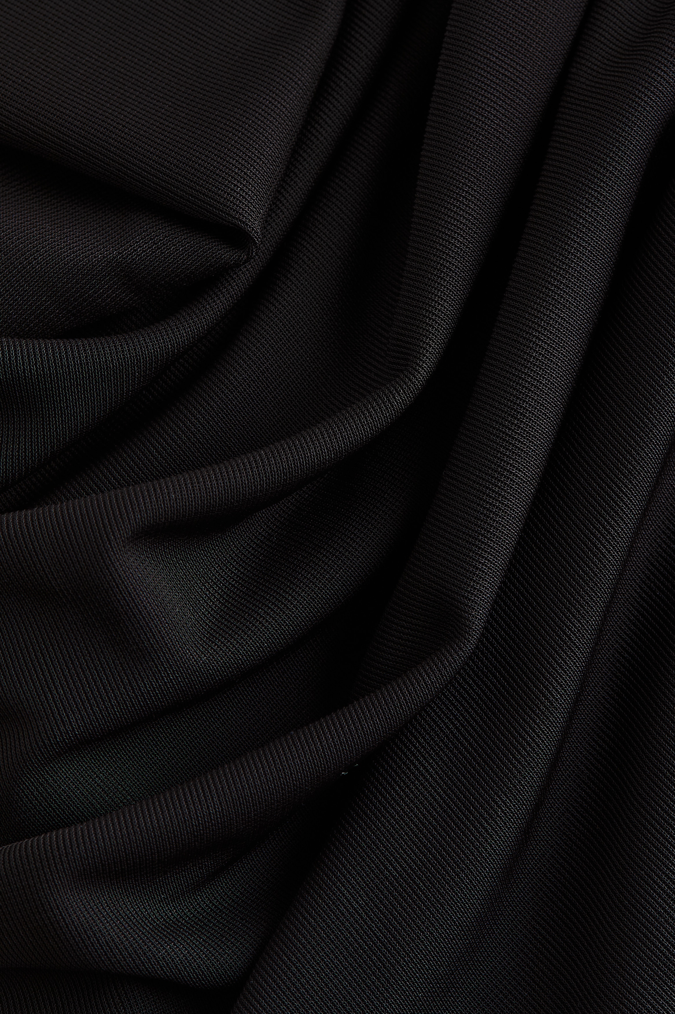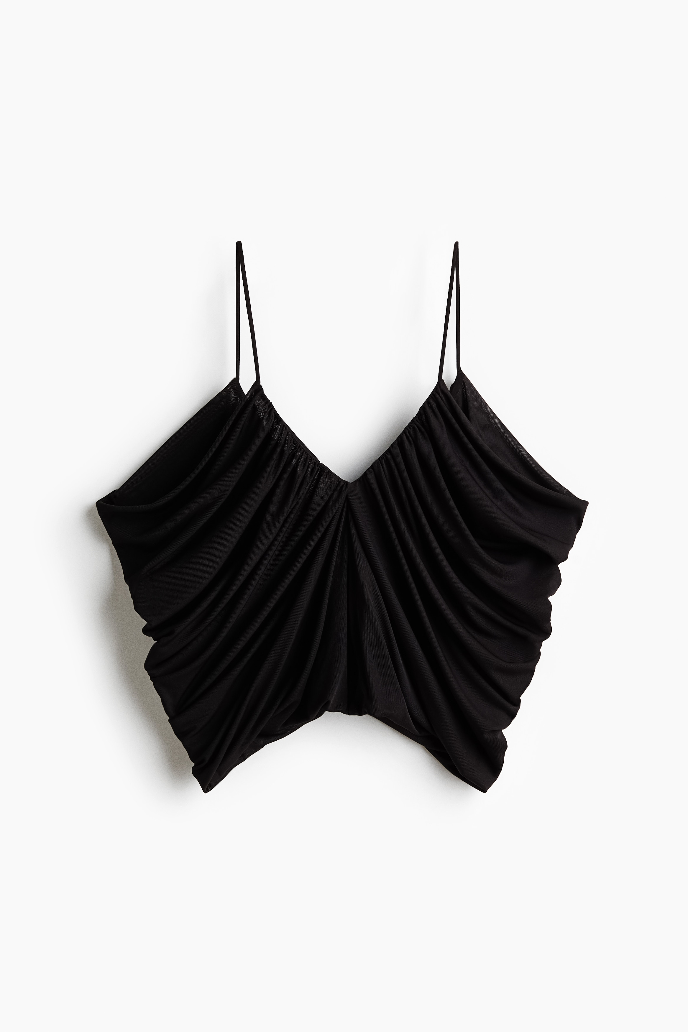 Short top in sheer jersey featuring a deep V-neckline with generous gathers at the front and back to create a draped effect. Spaghetti shoulder straps and a curved hem. Lined.