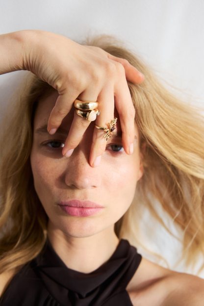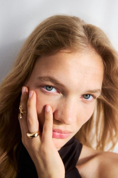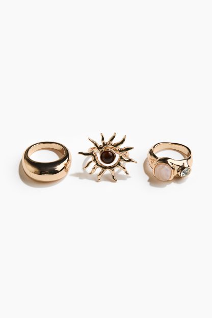 Metal rings in various designs, one in the shape of a sun and one embellished with a plastic bead and a sparkling rhinestone. Wear them individually or style them together for a personalised look.