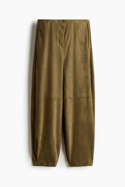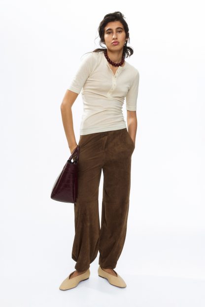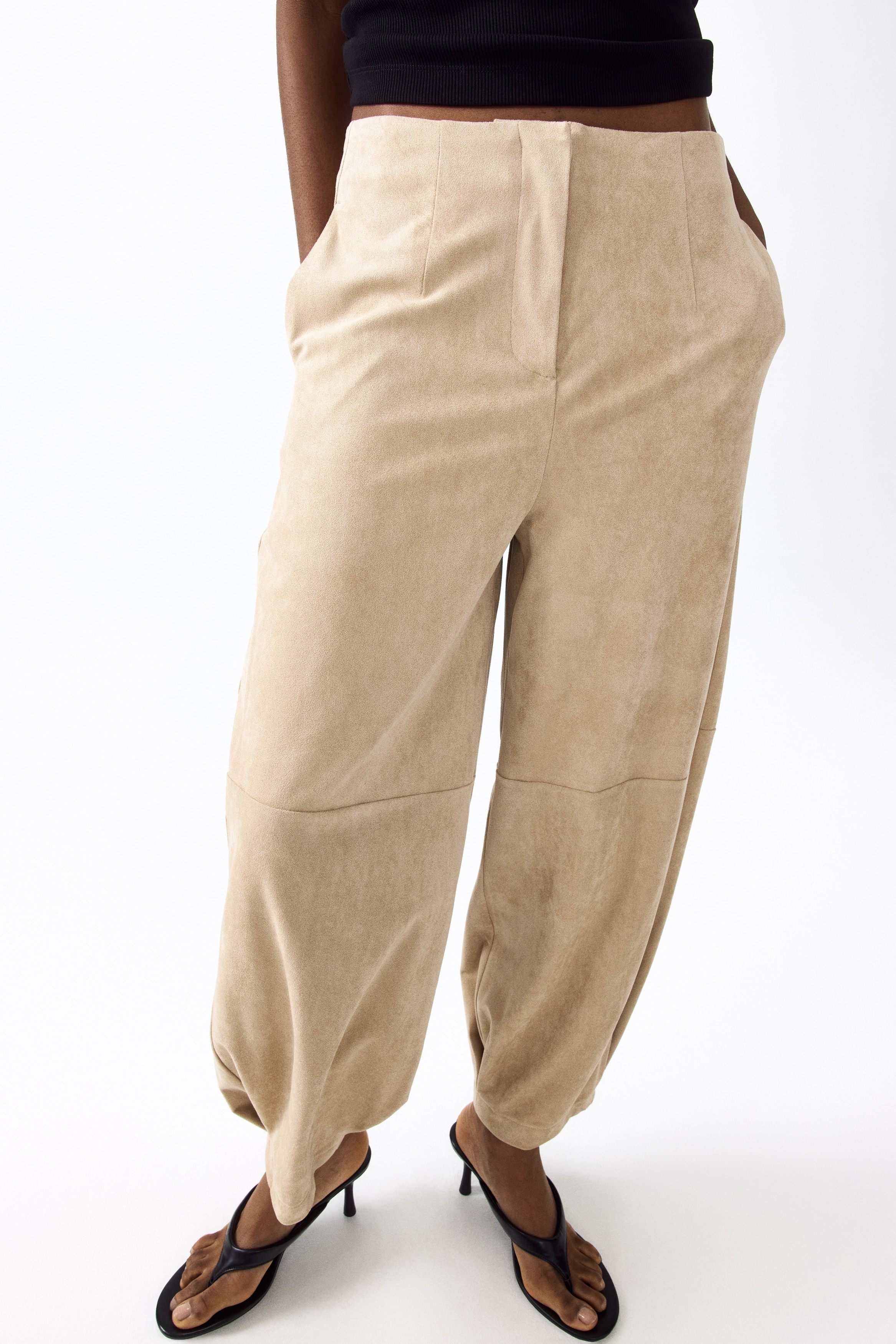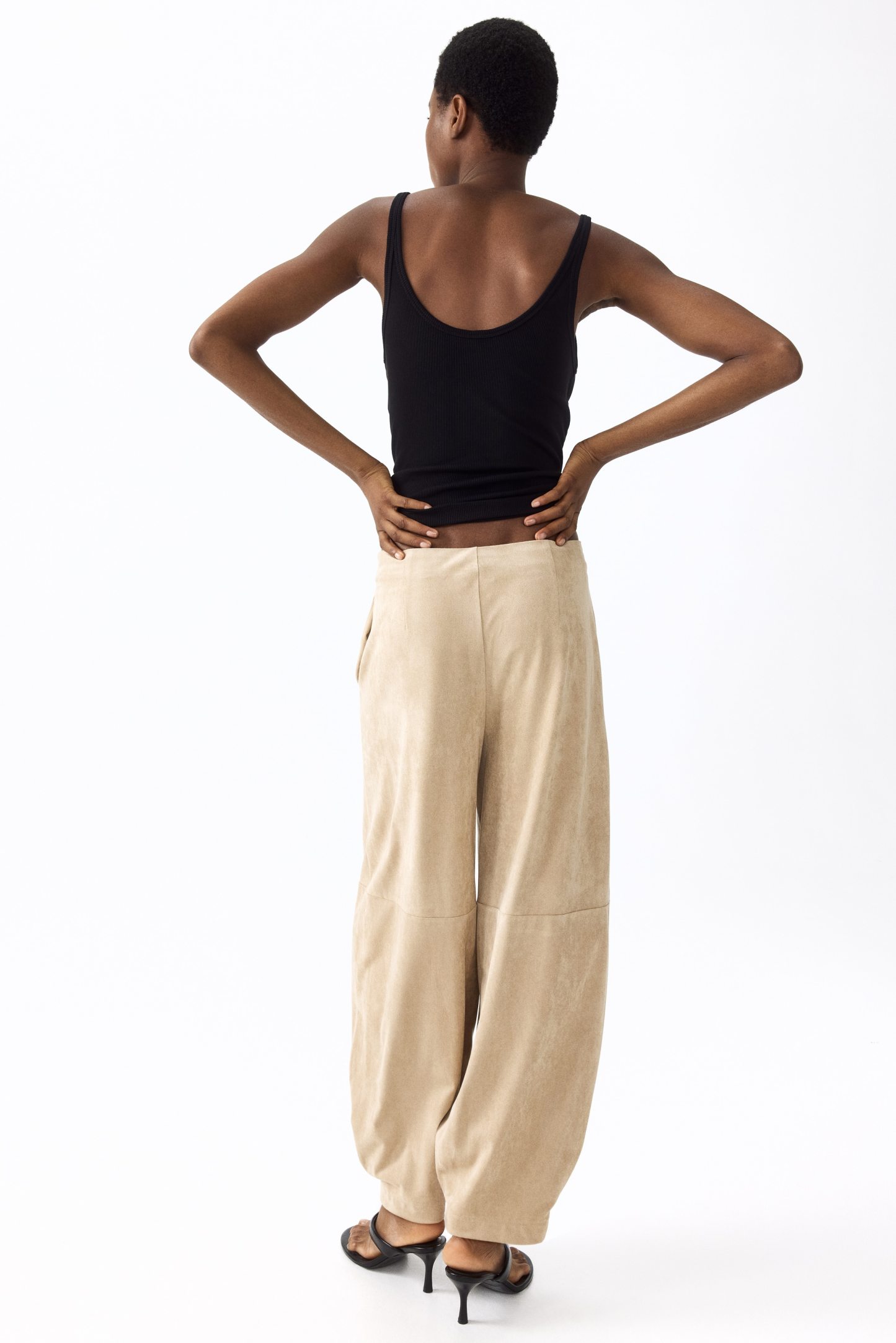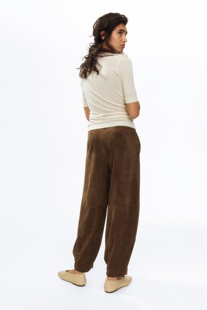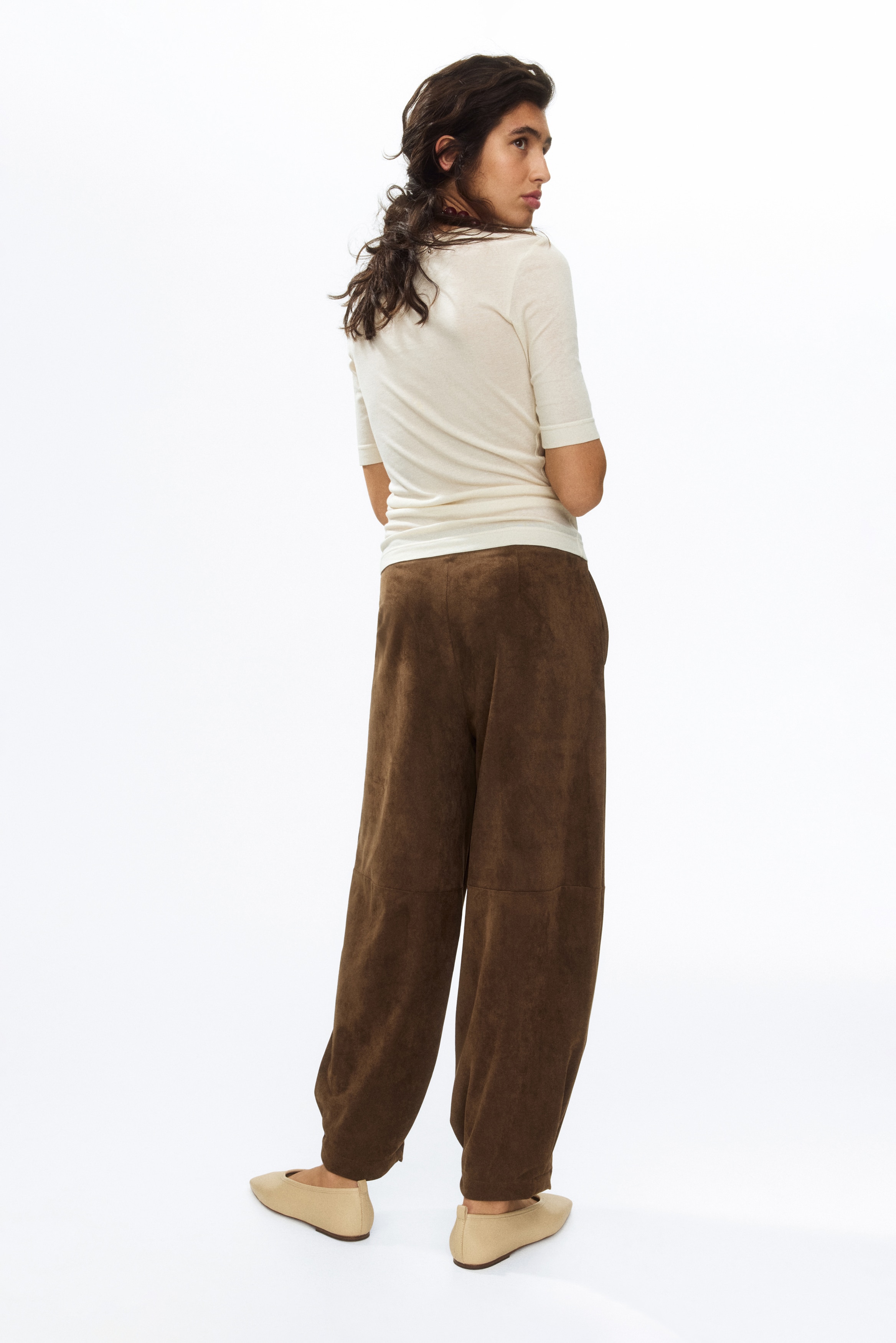 Trousers in jersey with a soft, napped finish featuring a zip fly with a concealed hook-and-bar fastener. Discreet side pockets and barrel legs with a visible seam at the knees and a pleat at the hems.