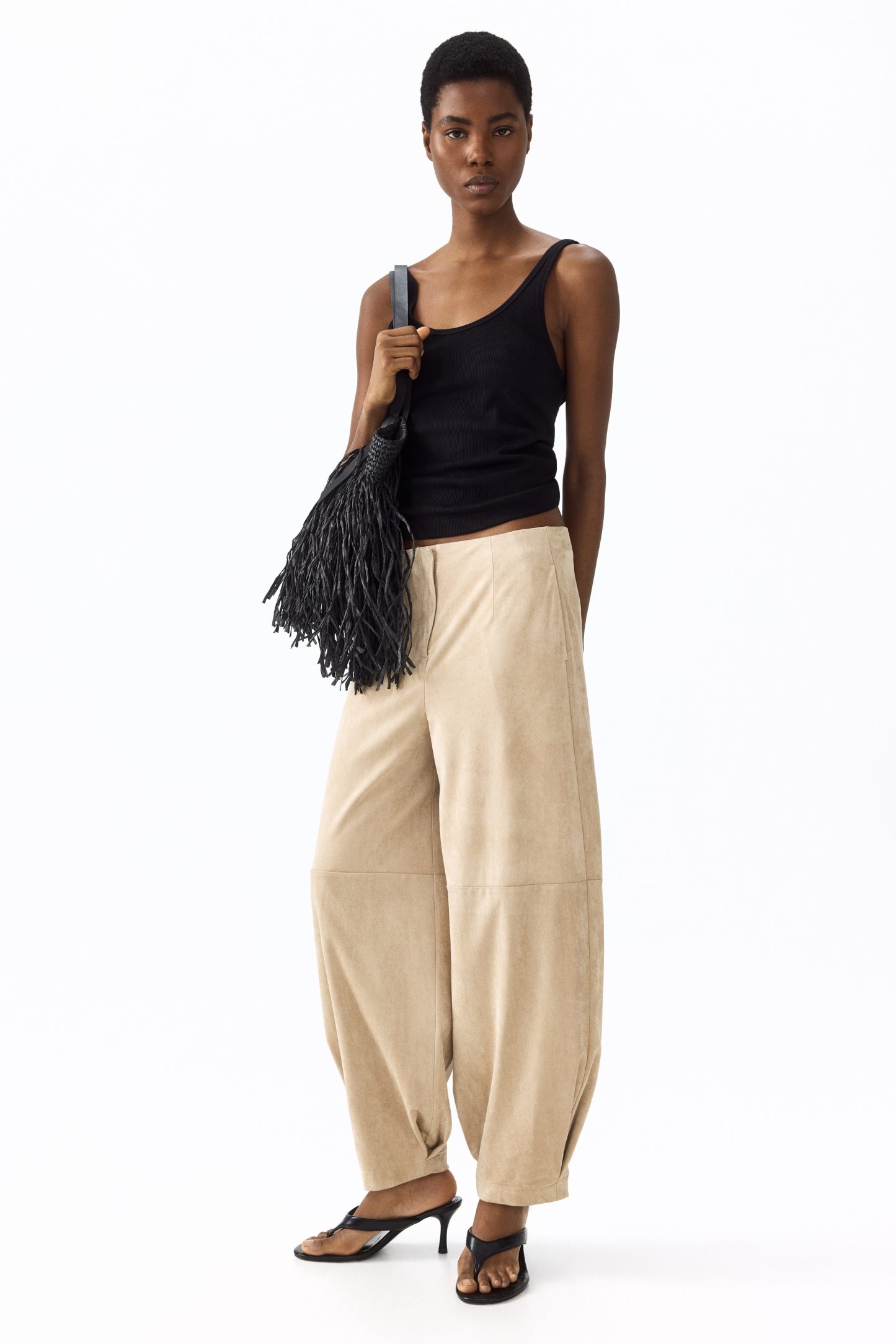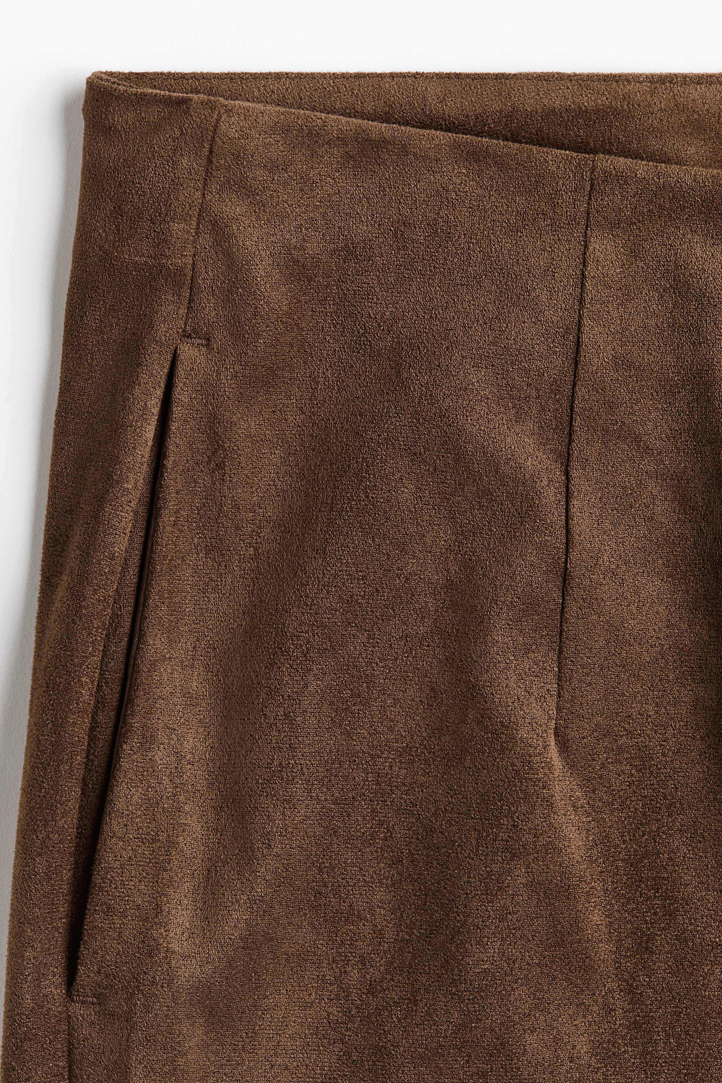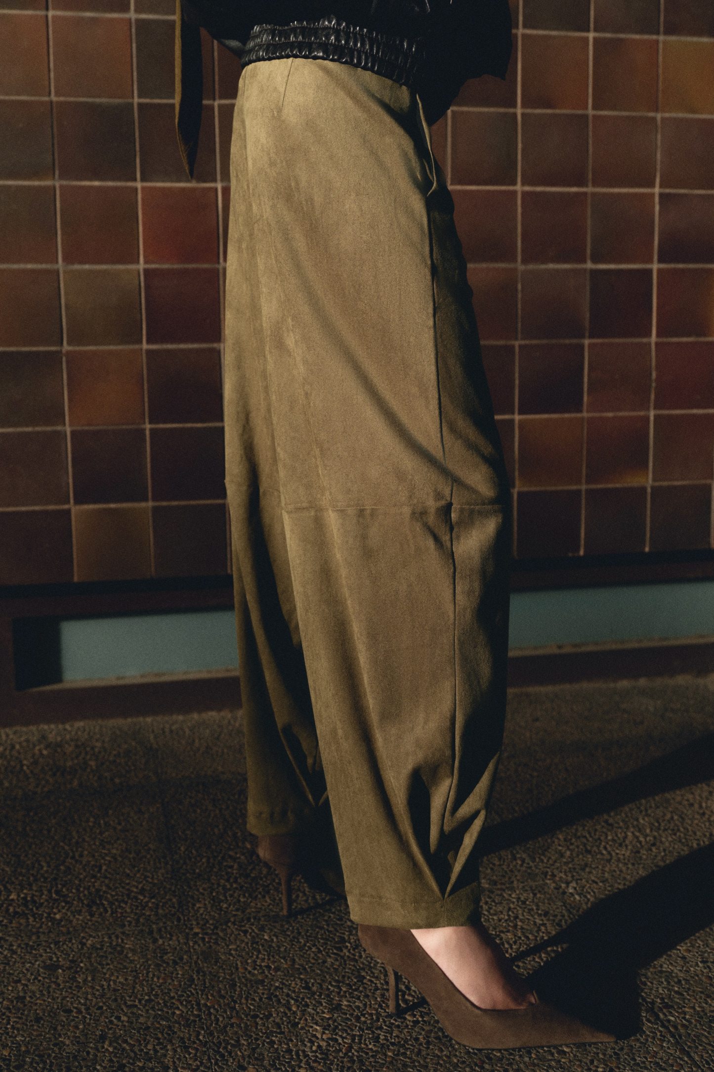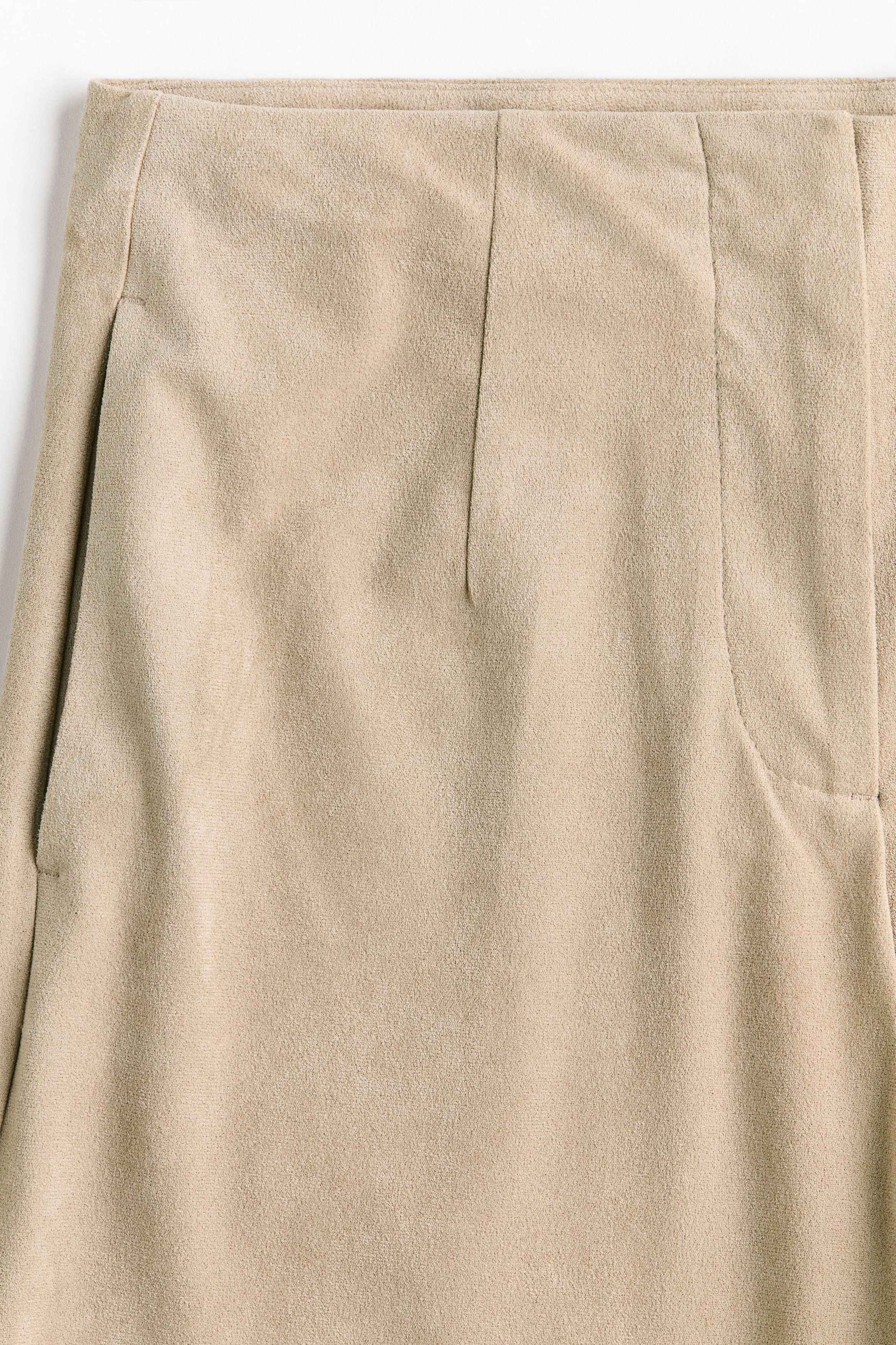 Trousers in jersey with a soft, napped finish featuring a zip fly with a concealed hook-and-bar fastener. Discreet side pockets and barrel legs with a visible seam at the knees and a pleat at the hems.