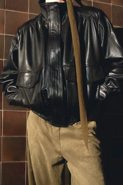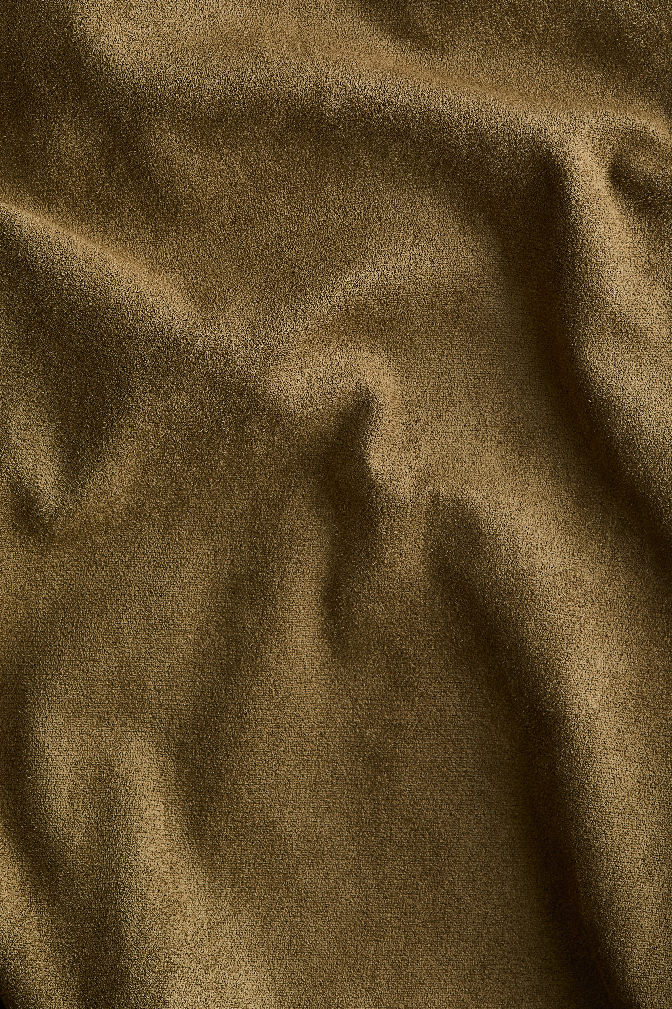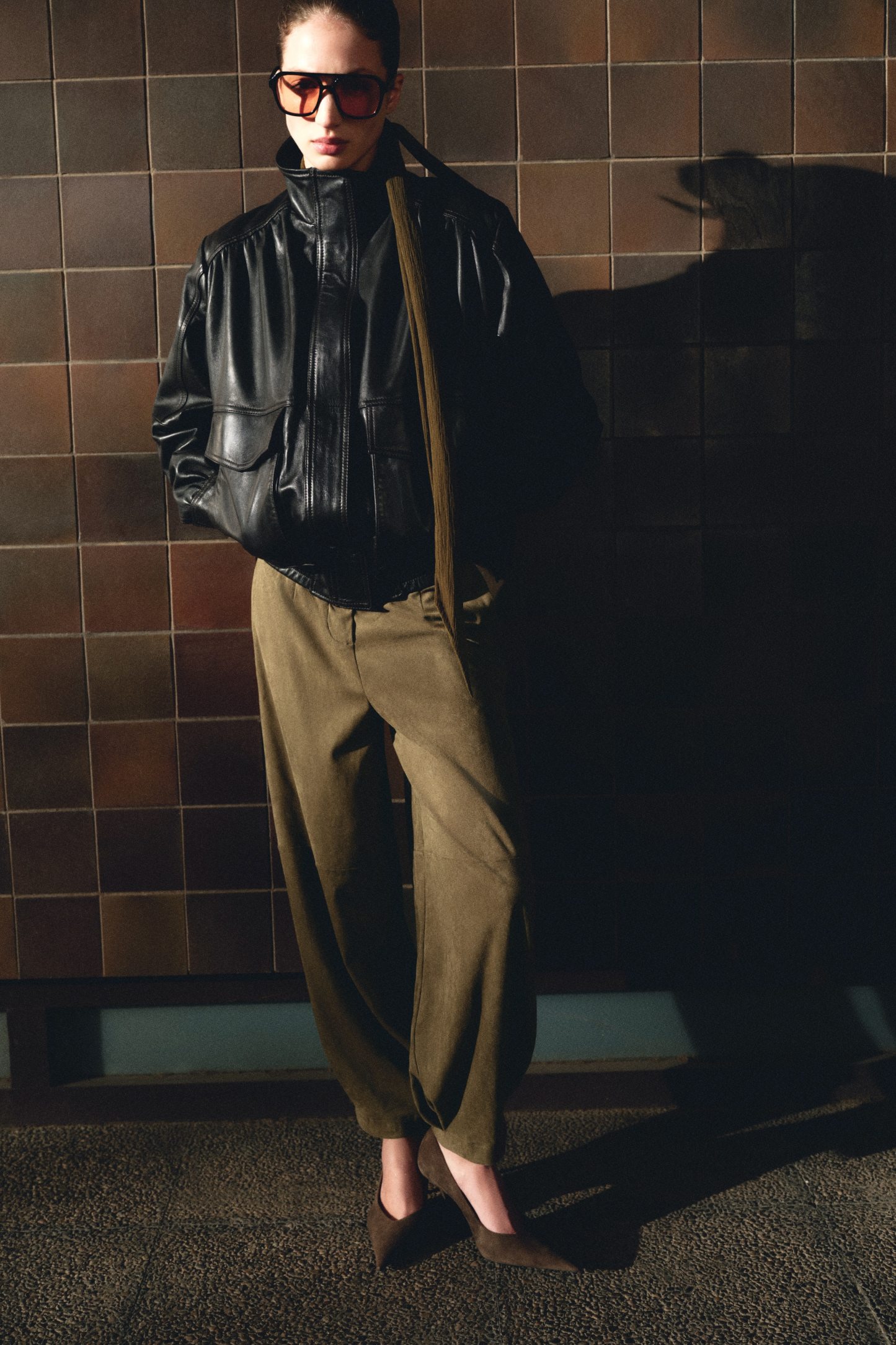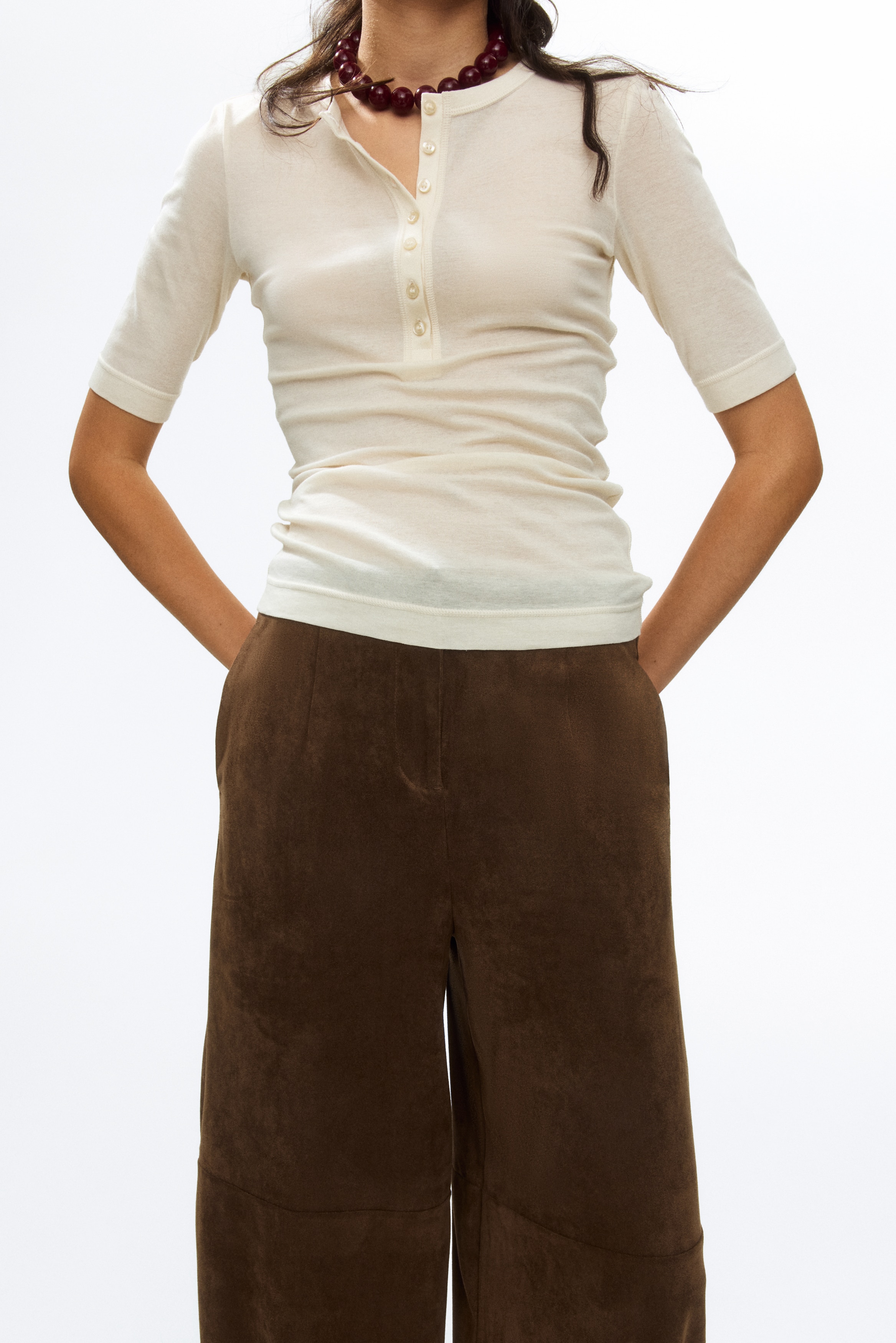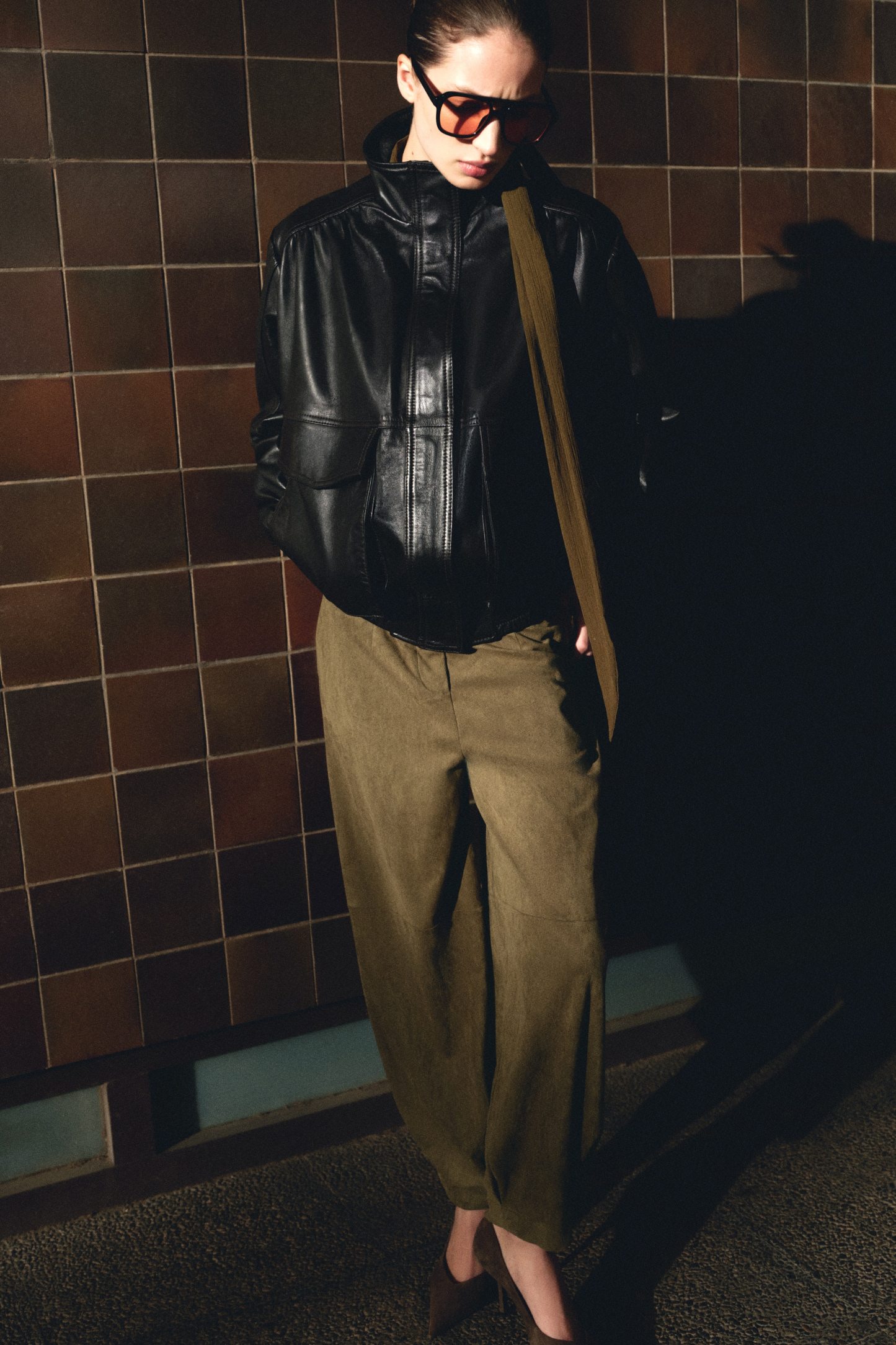 Trousers in jersey with a soft, napped finish featuring a zip fly with a concealed hook-and-bar fastener. Discreet side pockets and barrel legs with a visible seam at the knees and a pleat at the hems.